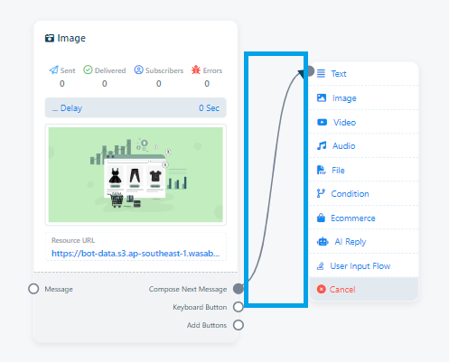 • Drag a connector from the `Start Bot flow` socket and leave the cursor to get component list. Select a desired component as required.